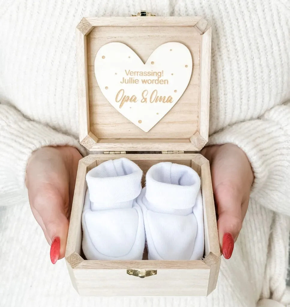 Vertel je ouders of vrienden dat je een kindje verwacht met dit houten kistje. Binnenin vind je een paar witte katoenen babyslofjes schattig én bruikbaar!