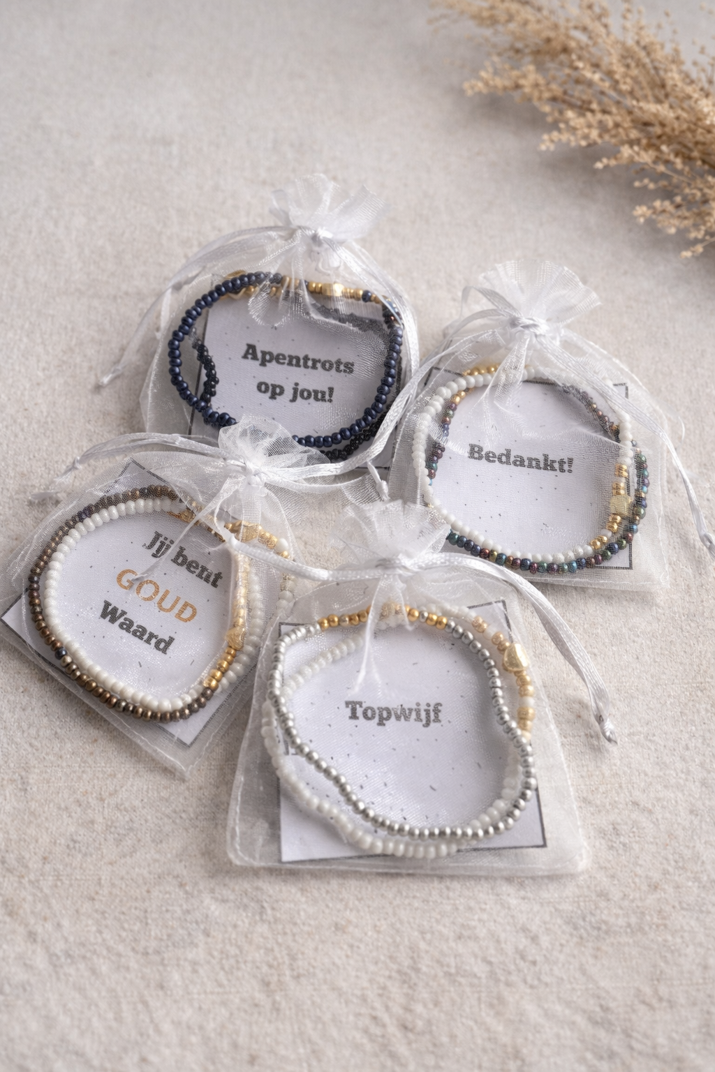Een subtiel en stijlvol armbandje in een mooi organza zakje, gecombineerd met een kaartje naar keuze. Perfect als klein gebaar met een grote betekenis om iemand te bedanken, te verrassen of een hart onder de riem te steken.