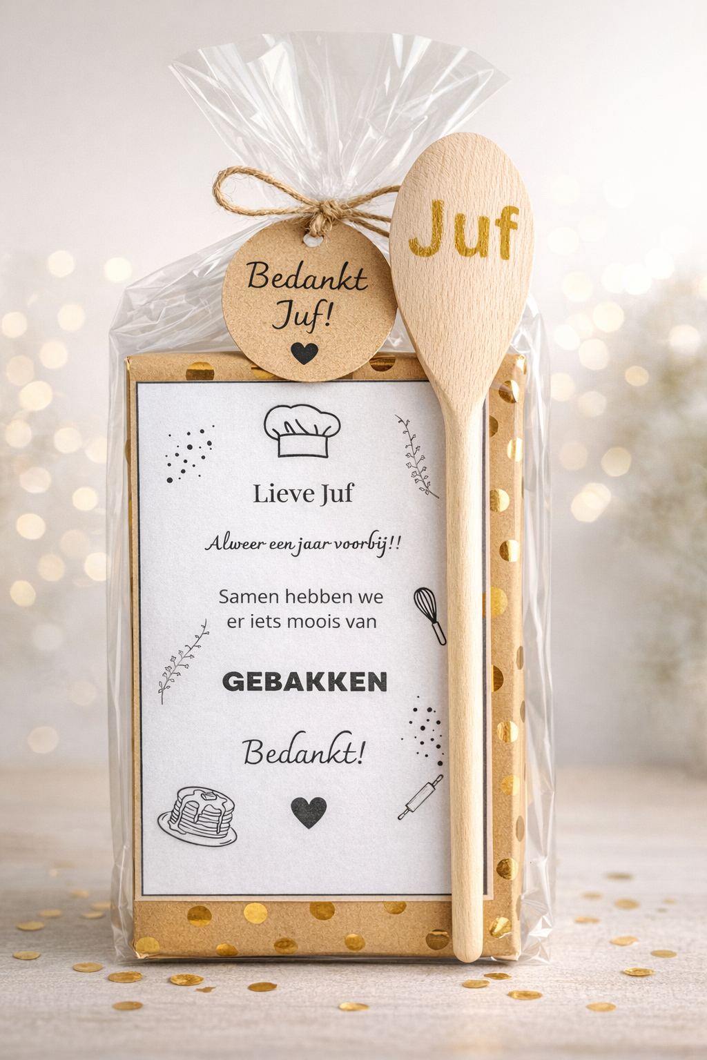 Deze set bestaat uit een houten lepel met de opdruk “Juf” & Pannenkoekenmix. Samen vormen ze een klein maar betekenisvol cadeau om te laten zien hoeveel waardering er is voor een jaar vol inzet, geduld en liefde.