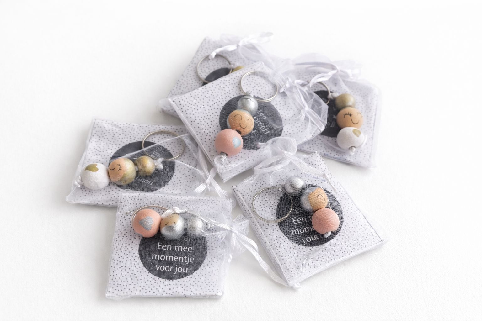 Elk setje bestaat uit een mooi gelukspoppetje aan een sleutelhanger, gecombineerd met een theezakje in een stijlvol organza zakje. Ideaal als bedankje voor juf of meester, een collega, vriendin of gewoon voor jezelf.