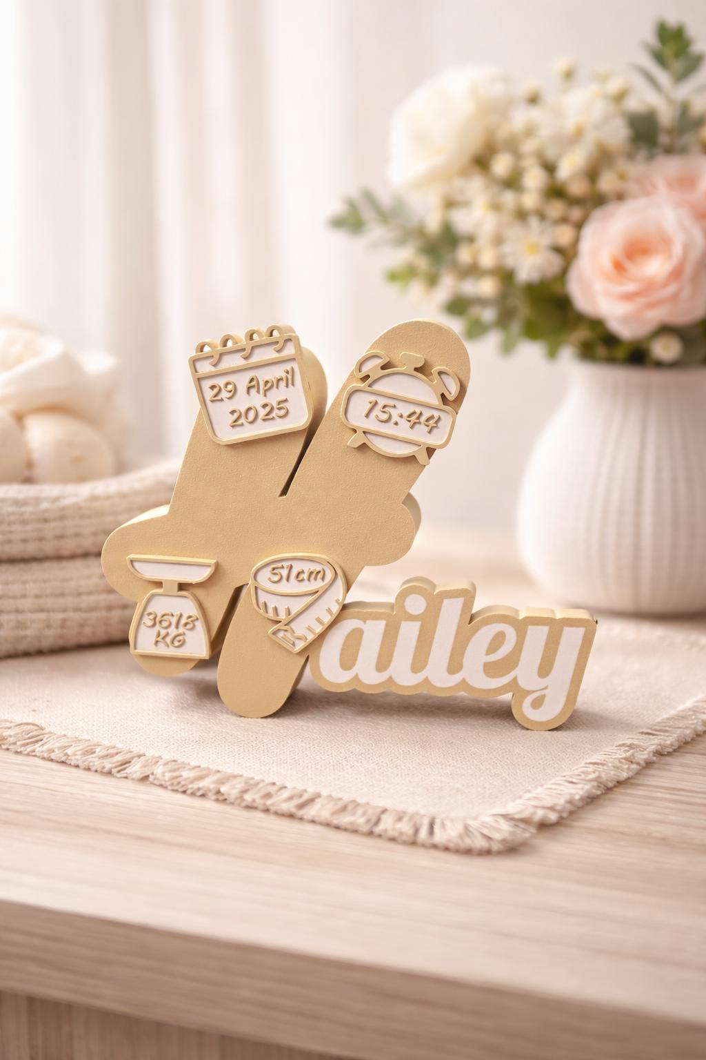 Dit stijlvolle geboortebord is een prachtige manier om de komst van een kindje vast te leggen. Het vrijstaande bordje staat mooi in de babykamer, op een plank of kast en bevat de naam van het kindje samen met belangrijke geboortegegevens zoals datum, tijd, gewicht en lengte.