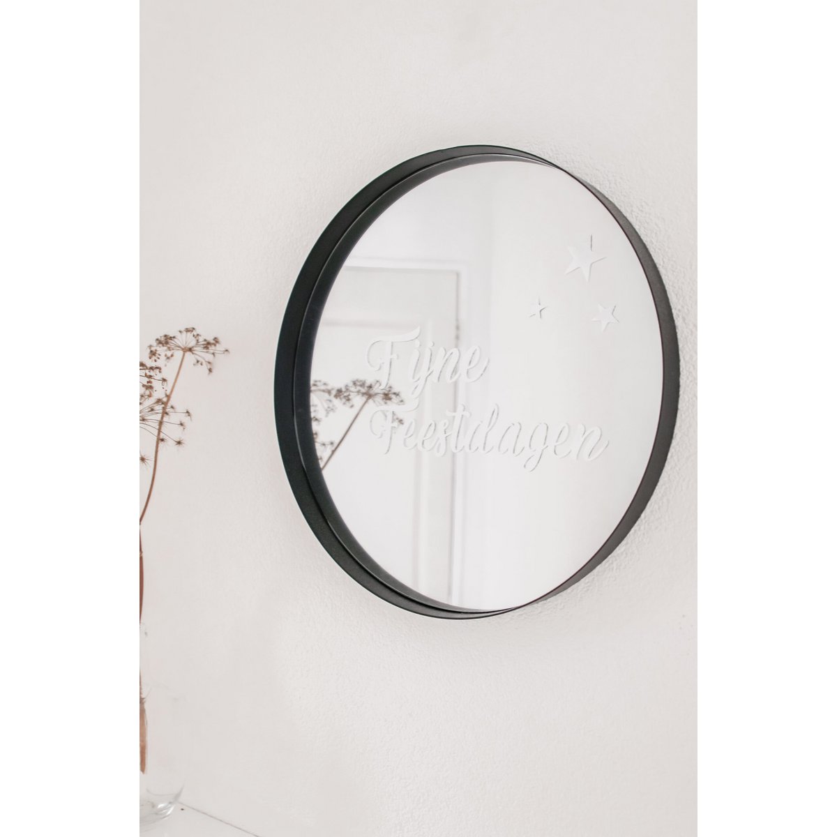 FIJNE FEESTDAGEN met een aantal sterren voor eromheen. Je kunt hem in het wit of zwart bestellen. De statische raamstickers zijn herbruikbaar en zijn aan beide zijden te plakken. Het fijne van statisch is dat het geen vervelende lijmresten op het oppervlak achterlaat.